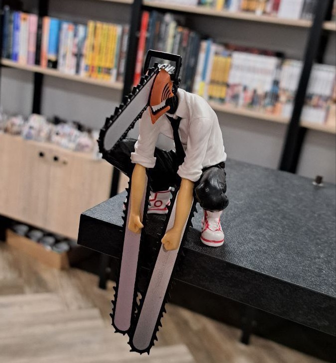 Колекційна фігурка в стилі аніме/манґи: персонаж із бензопилами замість рук у динамічній позі. Деталізоване виконання, яскраві кольори, стійка основа. Підійде для фанатів японської попкультури, декору полиці або як оригінальний подарунок.