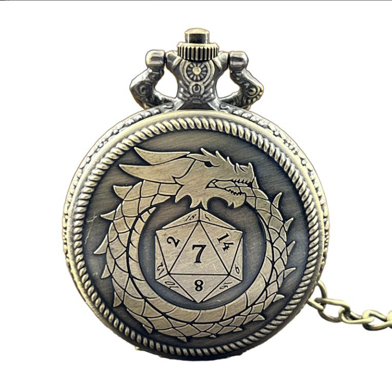Стильний металевий кейс у вінтажному дизайні — ідеальне рішення для шанувальників Dungeons & Dragons. Кришку прикрашає гравіювання у вигляді дракона, що охоплює 20-гранний куб, що символізує нескінченність пригод і магію гри. Усередині — набір маленьких металевих дайсів, які зручно зберігати та брати із собою.
