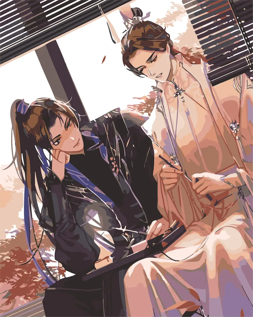 Витончена естетика: Схема малювання розроблена так, щоб передати ніжність білих ханьфу Чу Ваньніна та вогняну енергію Мо Жаня, створюючи ідеальний баланс на полотні.