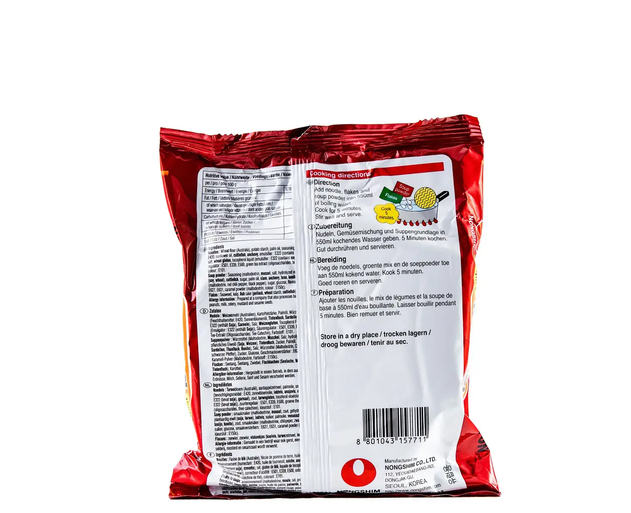Локшина рамен швидкого приготування Nongshim – це корейський різновид локшини зі смаком гострого чилі. Цей пакетик локшини швидкого приготування містить достатньо сушеного рамена для однієї порції, морепродуктів, включаючи каракатиці, анчоуси, тунець і креветки, а також пакетик гострого корейського соусу чилі для приготування супу.