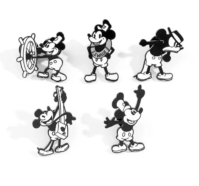 Ці класичні металеві піни повертають нас до витоків Disney — чорно-білий стиль раннього Міккі Мауса (“Пароплав Віллі”). Вони зображують Міккі у різних ностальгічних позах, від капітана до музиканта. Ідеальний аксесуар, щоб додати вінтажної елегантності та магії Disney!