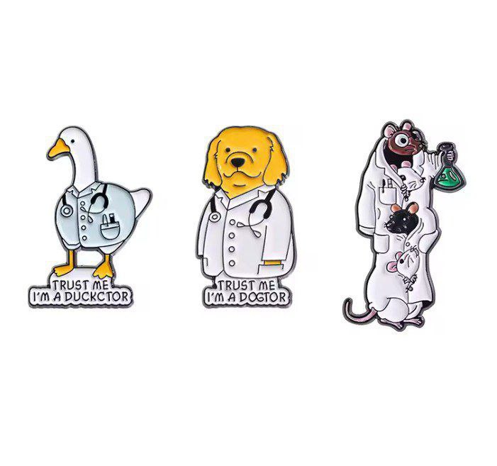 Металеві піни з милими тваринками, одягненими у костюми докторів — стильний та веселий аксесуар для рюкзака, одягу чи сумки. Вони чудово підходять як подарунок для медичних працівників, студентів-медиків або всіх, хто любить к’ют-стиль та незвичайні деталі в образі. Якісна емаль та міцний метал забезпечують довговічність, а яскраві кольори роблять аксесуар помітним і привабливим.