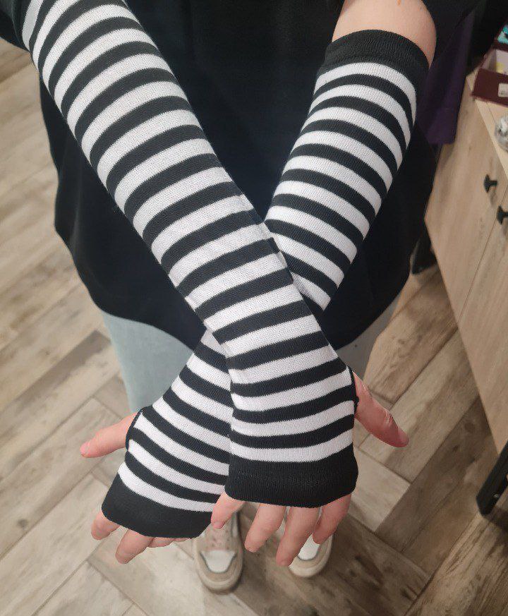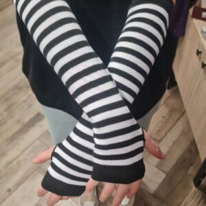 Стильні та зручні рукавиці без пальців, виконані у контрастних чорно-білих смужках. М’які, еластичні та приємні на дотик — чудово підходять для стрітстайлу, хіп-хоп образів або просто як яскравий аксесуар на кожен день. Завдяки відкритим пальцям у них зручно користуватися телефоном, писати чи грати.