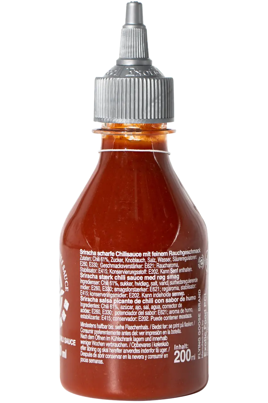 Найвідоміший гострий соус шрирача з ароматом диму Flying Goose Brand для приготування страв з м’яса і риби в якості маринаду, підходить для будь-яких страв як гостра приправа. По гостроті порівнюється з соусом Табаско, але має більш томатний копчений смак і аромат. Шрирача – це оригінальний варіант гострого чилі-соусу, який використовується в кулінарії Південно-Східної Азії повсюдно. Для його приготування застосовуються не найекзотичніші інгредієнти, але при цьому сам соус має характерний гостро-солодкий смак, який не сплутати ні з чим.