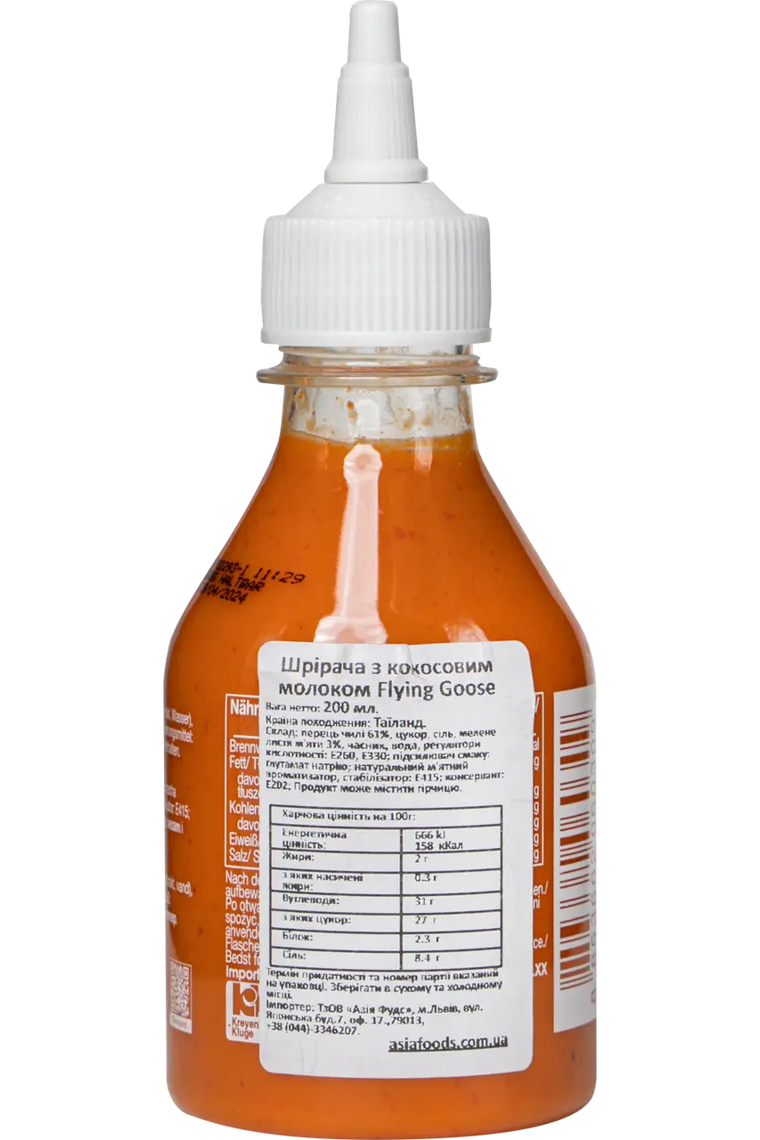 Соус Шрірача з кокосовим молоком FLYING GOOSE, 200 мл — це оригінальне поєднання пряної гостроти класичної шрірачі з ніжною, кремовою текстурою кокосового молока. Такий мікс створює унікальний баланс — водночас пікантний і м’який, ідеальний для додавання у страви паназійської кухні, карі, рис, локшину, супи, салати чи маринади.