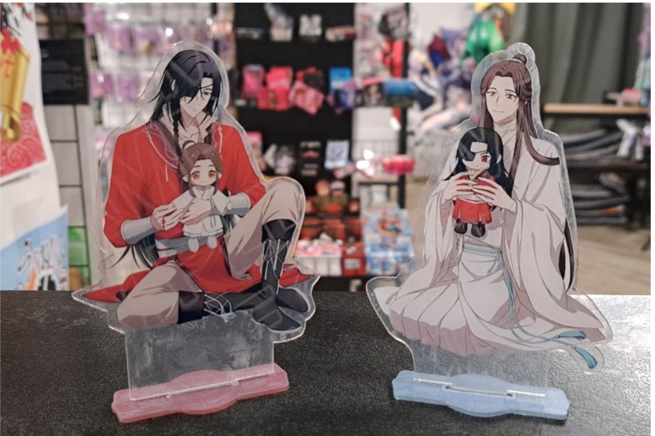 Акриловий стендик «Благословення небожителів» — це витончена колекційна фігурка, що зображує головних героїв новели Мосян Тунсю у надзвичайно милому образі. На вибір представлені дві композиції: величний Хуа Чен, що тримає маленьку ляльку Сє Ляня, та добрий Сє Лянь із мініатюрним Сань Ланем на руках.