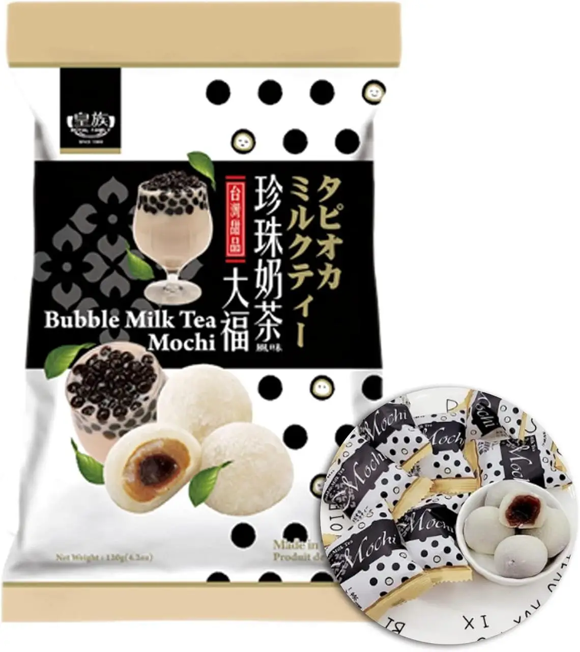 Bubble Milk Tea Mochi ROYAL FAMILY, 120 г — це традиційні японські тістечка моті з унікальною начинкою зі смаком популярного напою Bubble Tea (боба-чаю). Рисова оболонка м’яка, пружна та приємна на смак, а всередині — солодка, ароматна начинка з молочним чаєм і натуральним карамельним присмаком.