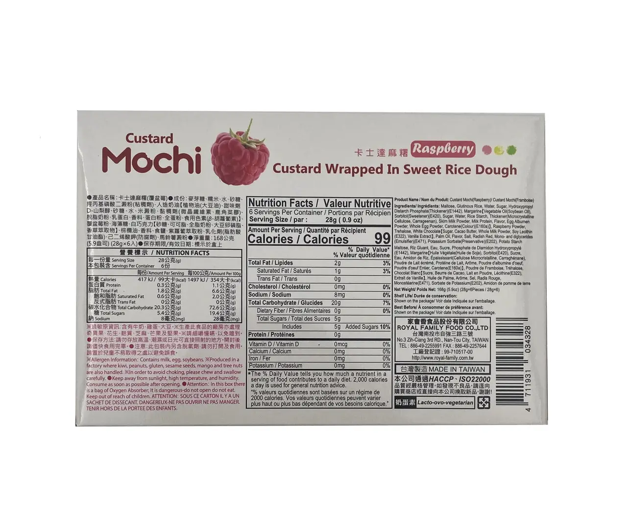 Смак тайванської солодощі зі смаком малини, загорнутим у солодке тісто рису. Уявіть собі десерт, який буквально тане у вас у роті, наповнює його неймовірною насолодою, яка залишається після того, як ви перестали насолоджуватися ним. Тепер, коли ви знаєте смак цього тістечка, придбайте моті з малиновим заварним кремом Royal Family вже сьогодні!