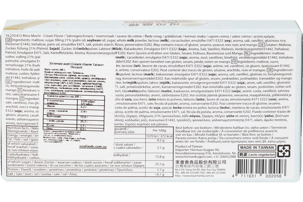 Смачне рисове печиво моті в міні-версії з кремовою начинкою. Ідеальний спосіб почати свою пригоду з азіатських солодощів – упаковка містить 8 шматочків моті, які розташовані на двох підносах. Неповторний смак! М’який азіатський десерт, який набуває все більшої популярності в Європі. Чудово підходить для подарунка або солодкої закуски!