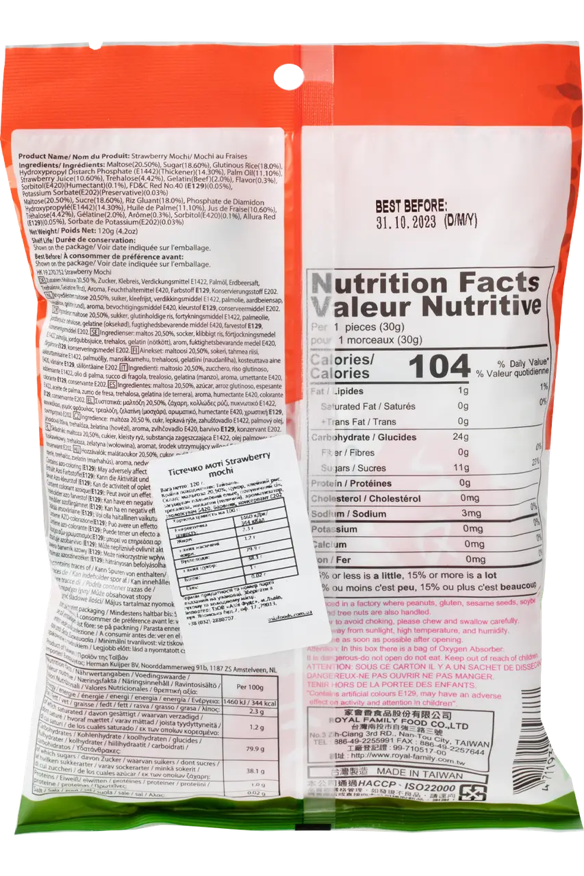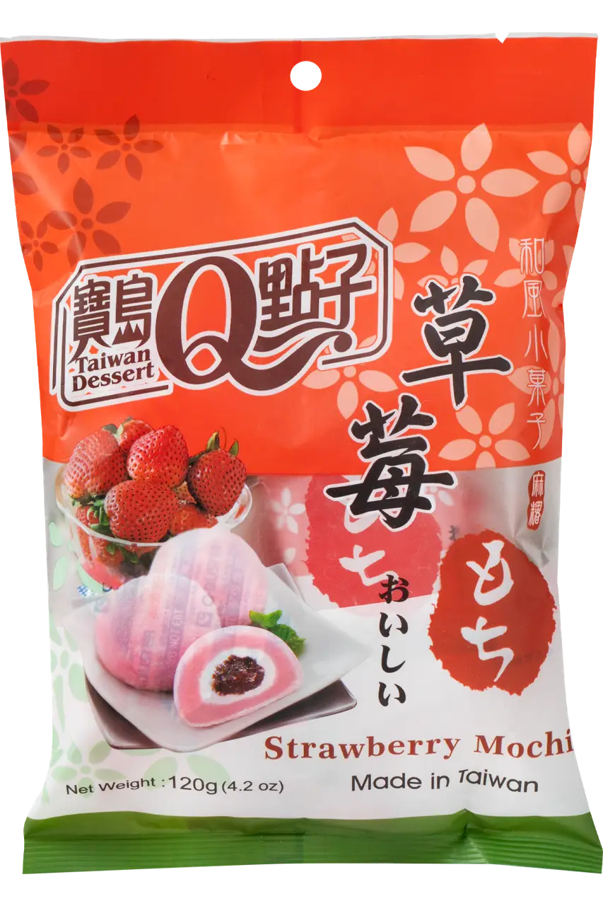 Mochi Strawberry Taiwan Dessert — один із найпопулярніших сортів моті. Він наповнений м’яким і солодким полуничним пюре, яке надає свіжий і фруктовий смак, а жувальне рисове тісто надає приємну щільність і текстуру. Це робить його чудовою закускою чи десертом, яким можна насолоджуватися будь-коли.