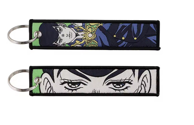 Стильний тканинний брелок у стилі «JoJo’s Bizarre Adventure». Має дві різні вишиті сторони: на одній зображено персонажа, на іншій — крупний план очей. Якісний щільний матеріал, акуратна окантовка та металева ключова дужка роблять його ідеальним аксесуаром для фанатів.